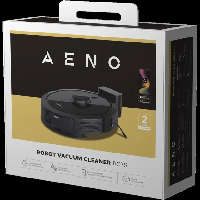 AENO RC7S je inovativen robotski sesalnik, ki olajša čiščenje doma. Opremljen je z baterijo 5200 mAh, ki omogoča do 250 minut delovanja. Njegova močna sesalna moč 4000 Pa učinkovito čisti vse površine. Ima rezervoar za vodo 300 ml in posodo za prah 300 ml, ki omogočata hkratno sesanje in brisanje. Zahvaljujoč tehnologiji LiDAR natančno preslika vaš prostor za optimalno čiščenje. Daljinsko ga lahko upravljate preko aplikacije AENO, deluje pa tiho z glasnostjo 68 dB.