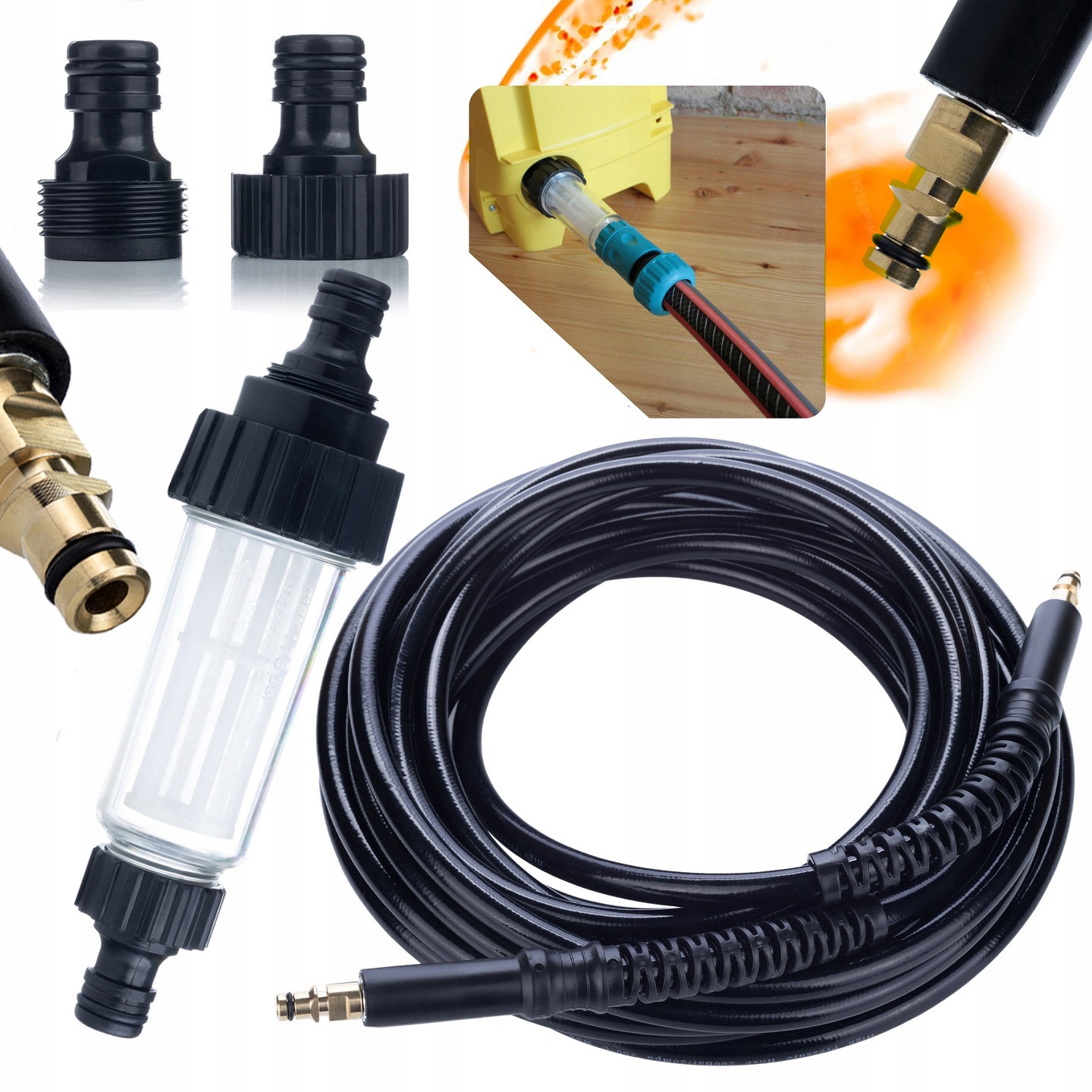 ROSFIX 10M VISOKOTLAČNA CEV CLICK-CLICK ZA TLAČNE ČISTILNIKE KÄRCHER K2 K3 K4 K5 K6 K7 + UNIVERZALNI VODNI FILTER ZA TLAČNE ČISTILNIKE KÄRCHER