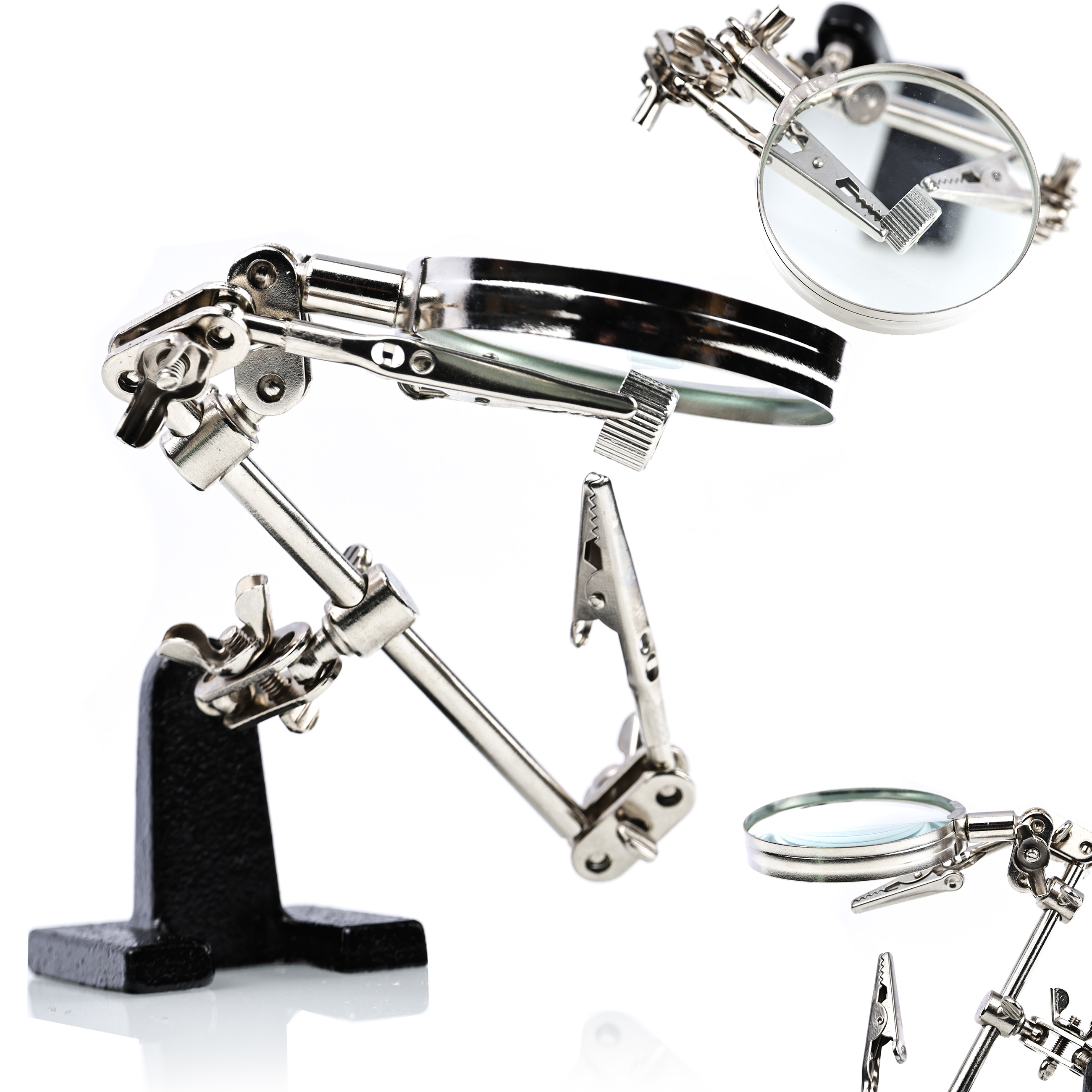 Komplet tretje roke z lupo je nepogrešljivo orodje za vsakega ljubitelja, modelarja ali elektrotehnika, ki potrebuje pomoč pri rokovanju z majhnimi komponentami med natančnim delom. Ta komplet olajša in naredi spajkanje ali sestavljanje veliko natančnejše.