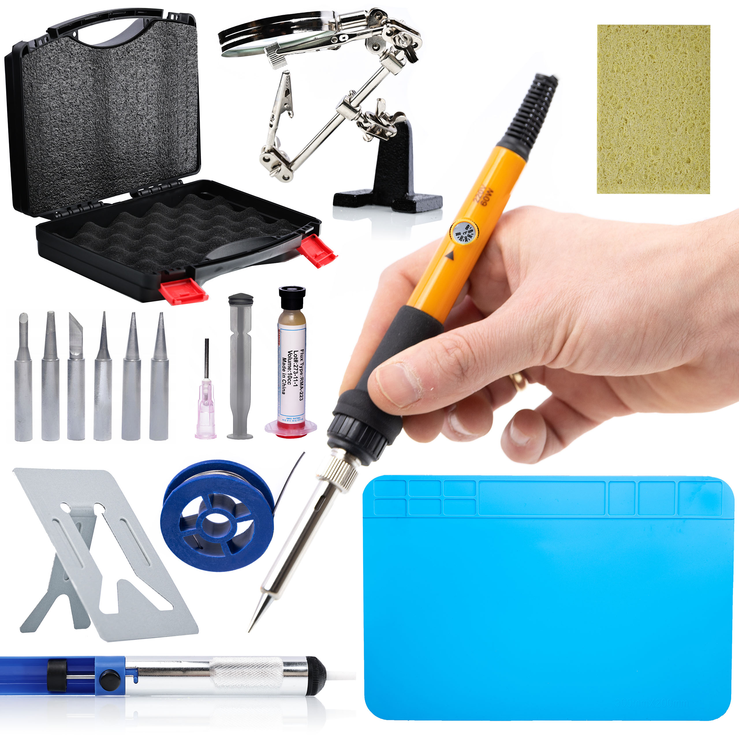 ✅ Priročen stojalo: Komplet vključuje stojalo, ki zagotavlja varno mesto za odlaganje spajkalnika med odmori pri delu. To poveča udobje uporabe in zmanjša tveganje poškodb delovne površine.