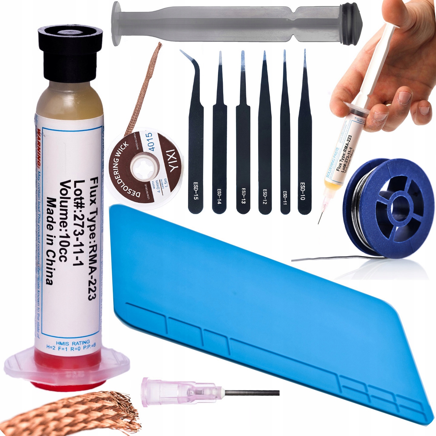 ROSFIX SET ORODJE ZA SPAJKANJE RMA-223 – FLUX, CEV, CEVKA, CEV, CEV, CEV | 0,8 MM CEV, 10 G, 10 CC, 3,5 MM X 1,5 M, 300 X 200 MM, 6X PINCETA