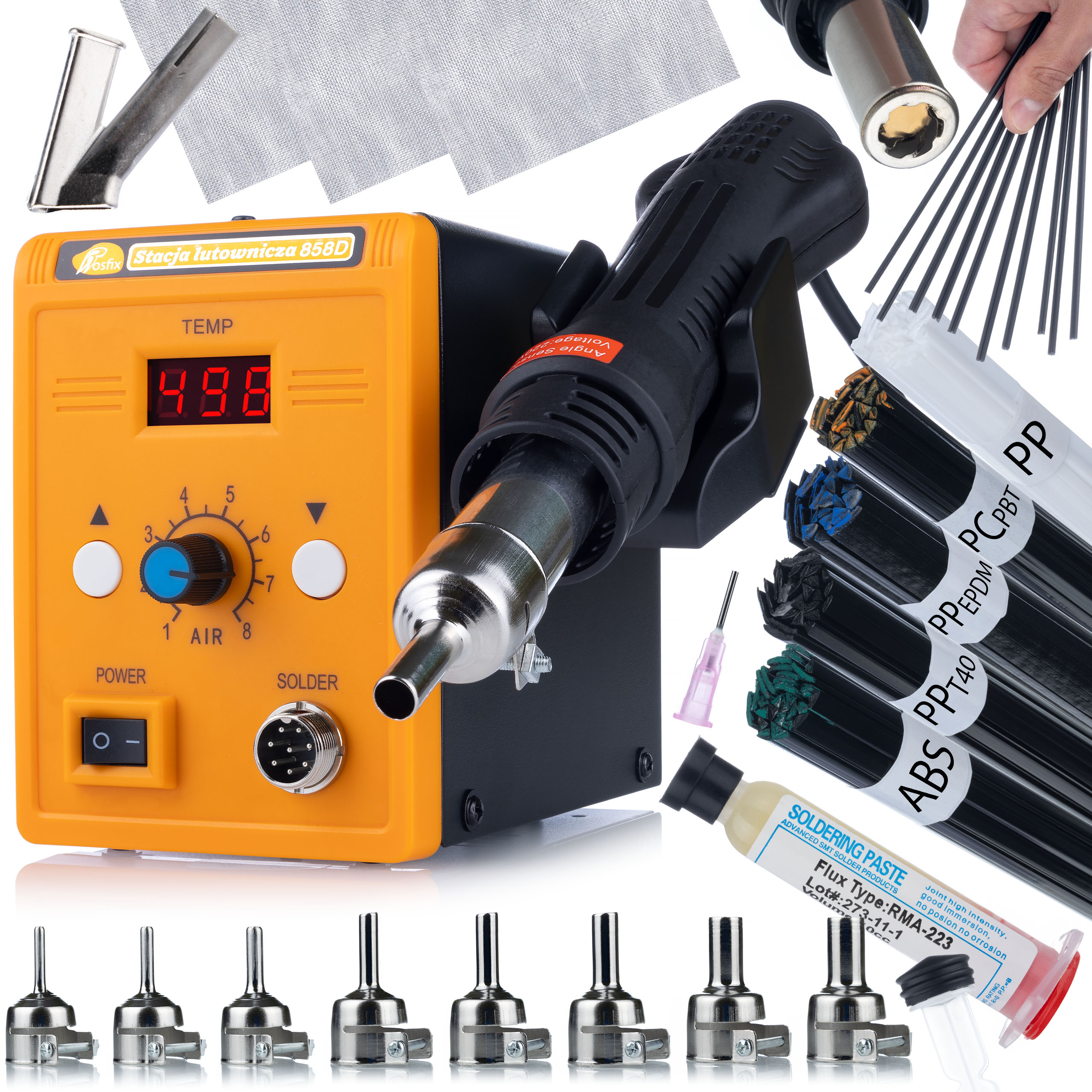 ROSFIX SET SPAJKALNA POSTAJA 858D BRIZGALNA GLAVA – 700W, 100–500°C, 8 DYSZ, FLUX, SPOJKE, MREŽE | PDF VODIČ