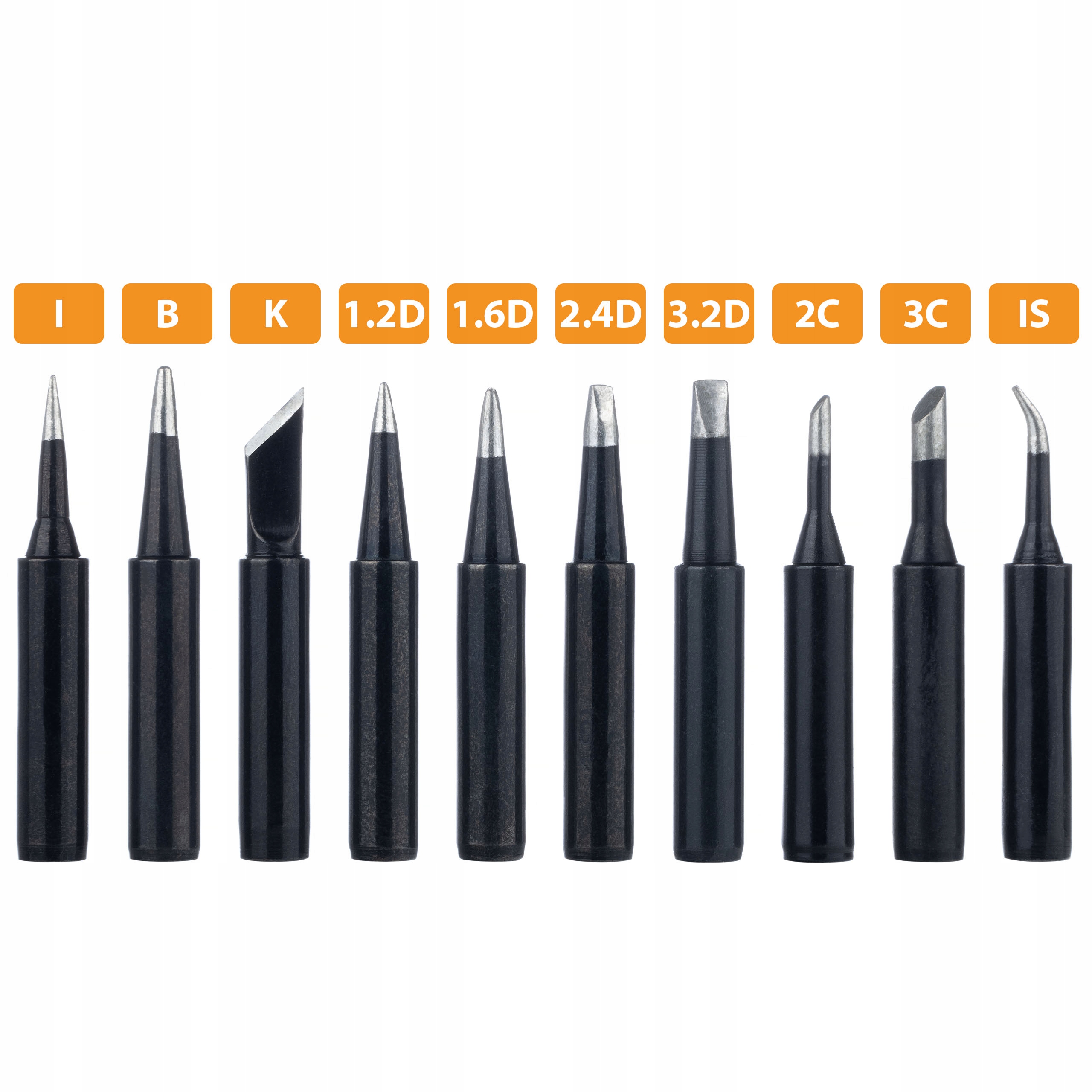Komplet konic vključuje različne oblike (I, B, K, 1,2D, 1,6D, 2,4D, 3,2D, 2C, 3C, IS), ki so primerne za spajkanje tako posebej majhnih ploščic kot večjih povezav. To zagotavlja, da boste vedno izbrali pravo konico za delo.