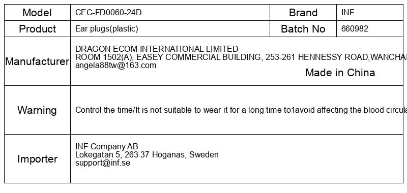 Nadzorujte čas/Ni primerno, da ga nosite dlje časa, da ne bi vplivali na prekrvavitev ušesa, izogibajte se odvisnosti/Ne zanašajte se na ušesne čepke običajno, še posebej se izogibajte njihovi uporabi v pomembnih primerih.