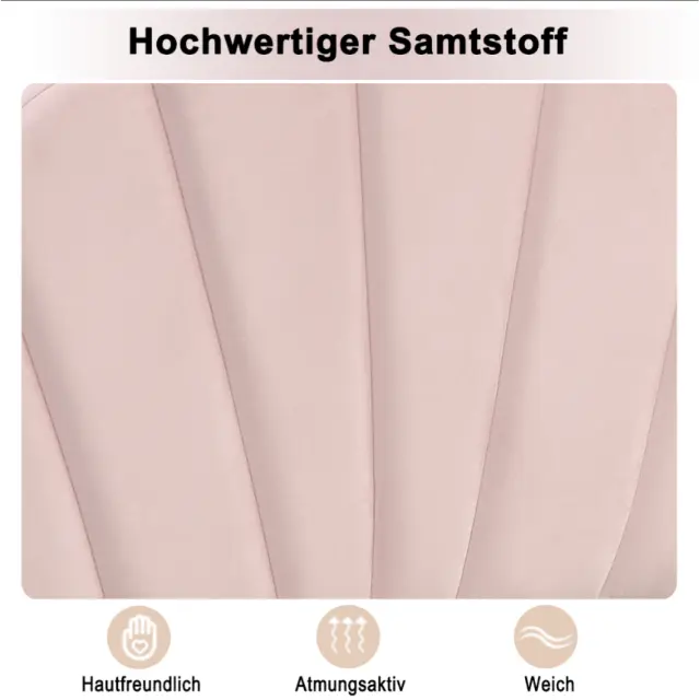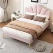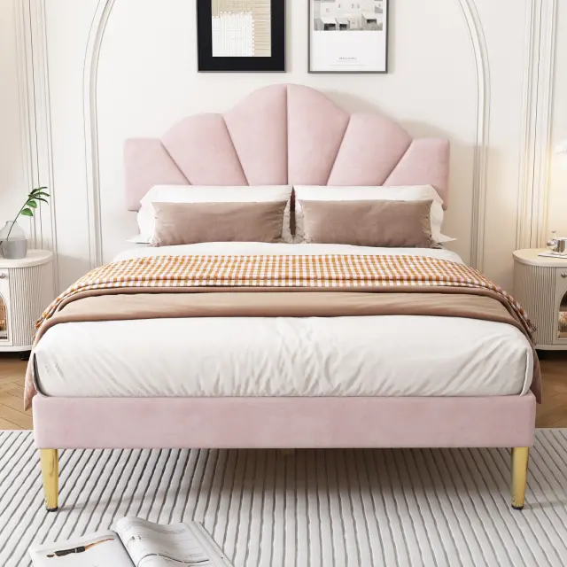 Roza žametna školjkasta postelja z zlatimi železnimi nogami, nastavljivim vzglavjem, lesenim letvenim okvirjem, 140x200 cm.