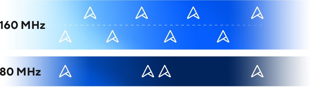 Ultraširoki 320 MHz kanaliWiFi 7 uvaja tri ultraširoke 320 MHz kanale v frekvenčnem pasu 6 GHz, kar podvoji zmogljivost prenosa podatkov. To omogoča bistveno več hkratnih prenosov pri najvišjih možnih hitrostih.