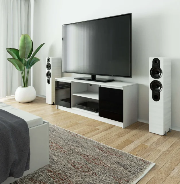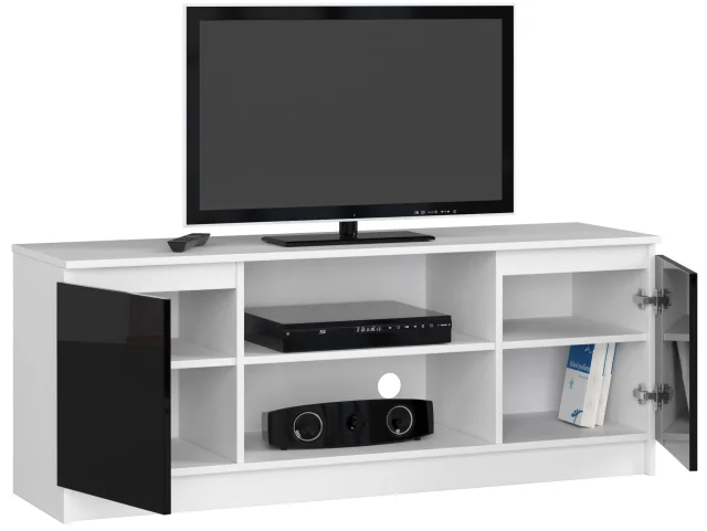 RTV 2D 1P omara je lepa, bela kos pohištva s črnimi sprednjimi deli, posebej zasnovana za televizor in dodatno avdio opremo/decoder. Pripravljena je tako, da lahko skoraj vsak model avdio opreme, ki je na voljo na trgu, ustreza dvema odprtima policama. Zelo je stabilna in udobna za uporabo, zahvaljujoč dvema dodatnima omarama, pa se lahko prostor izkoristi, na primer, za pomembne dokumente. Popolna bo za minimalistične prostore in tiste, ki so opremljeni na klasičen način.