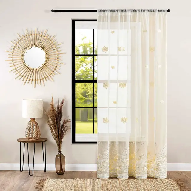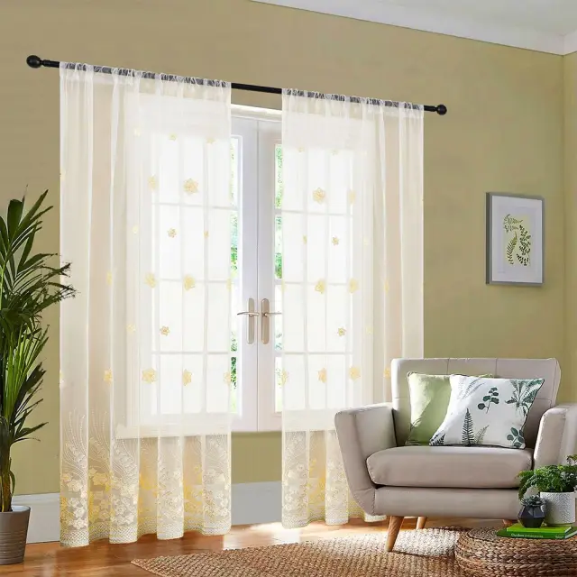 Elegantna cvetlična oblika: Povzdignite dekor svojega doma z našo rumeno vezeno cvetlično prosojno zaveso. Zapletena cvetlična vezenina doda pridih prefinjenosti in elegance vsakemu prostoru. Te zavese so kot nalašč za ustvarjanje toplega in prijetnega vzdušja v vaši dnevni sobi, spalnici ali katerem koli komercialnem prostoru. Nežen cvetlični vzorec omogoča filtriranje naravne svetlobe, hkrati pa zagotavlja določeno stopnjo zasebnosti. Rumeni odtenek dopolnjuje različne notranje sloge, zaradi česar je vsestranska izbira za vaš dom. Vezeni detajli prikazujejo izvrstno izdelavo, ki zagotavlja visokokakovostno in vizualno privlačno obdelavo oken. Te zavese so zasnovane tako, da izboljšajo estetsko privlačnost vašega prostora, hkrati pa ponujajo praktično funkcionalnost.