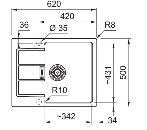 Model: S2D 611-62 Omarica: 45 cm Dimenzije: 620 x 500 mm Izrez: 604 x 484 mm (R = 7,5 mm) Velikost posode: 343 / 432 / 200 mm Vgradnja/namestitev: vgradni Smer posode: obračljivo Material: Tectonite Ventil: ročni ventil Regulacija ventila: ročno Izvrtina za armaturo: brez lukenj za armaturo