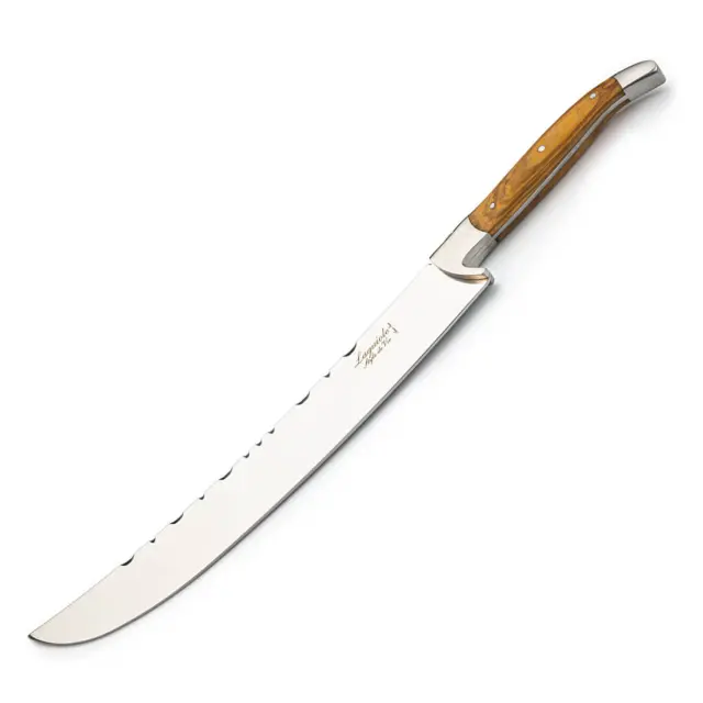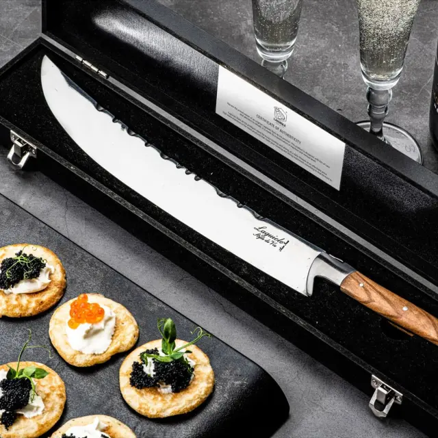 Odprite steklenico penine na spektakularen in eleganten način s šampanjsko sabljo Laguiole. Njen prefinjen ročaj iz oljčnega lesa združuje toplino narave z brezčasnim dizajnom, rezilo iz kaljenega nerjavečega jekla pa zagotavlja trpežnost in popolno izvedbo sabljanja. Rezilo je dolgo 27 cm in debelo 2,5 mm, posebej zasnovano za varno in učinkovito odpiranje steklenic. Sablja je pakirana v razkošni črni darilni škatli, zato je popolno darilo za ljubitelje penin in nepozabnih trenutkov ob nazdravljanju. Ni primerna za pomivanje v pomivalnem stroju.