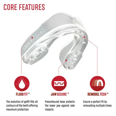 Njegova Fluid Fit™ tehnologija pomeni, da SAFEJAWZ® ščitniki imajo super-tanek profil in odlične zadrževalne lastnosti. Ščitnik se bo praktično prilepil na zobe in udobno prilegal, tako da dihanje, govorjenje in pitje ne bodo težava.