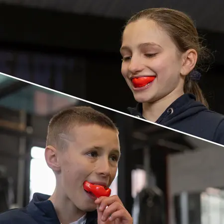 • FluidFit™: Ščitniki za usta so lahko neprijetni in nerodni, še posebej ko jih nosite z aparati za zobe! Z našimi samoprilagodljivimi ščitniki za usta (kuhaj in ugrizi) smo razvili poseben EVA material, ki postane podatljiv ob segrevanju in se prilagaja konturam ust, hkrati pa se strdi ob ohladitvi, da nudi zadostno zaščito. Zagotavlja, da se ščitnik za usta prilega kot ulit in je udoben ter neopazen pri nošenju.