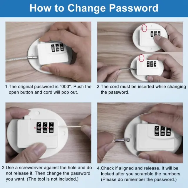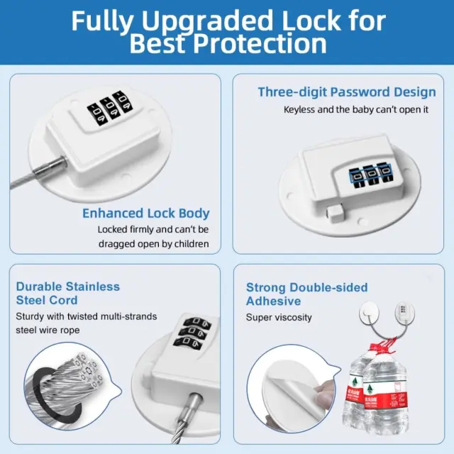 Vsestranska uporaba: Poleg hladilnikov lahko to kombinacijsko ključavnico uporabljate na različnih aparatih in pohištvu, vključno z omarami, zračnimi cvrtniki, pokrovi straniščnih školjk, okni, predali, vrati omaric in pralnih strojih. Zaradi lepilne zasnove jo je enostavno namestiti na skoraj vsako gladko površino, kar ponuja vsestransko rešitev za varovanje predmetov po vsem domu. Preprečite otrokom dostop do potencialno nevarnih predmetov ali omejite dostop do določene vsebine. Ta večnamenska ključavnica zagotavlja mirnost in pomaga ustvariti varnejše okolje za vašo družino. 30cm jeklena žica zagotavlja močno in zanesljivo zadrževanje.