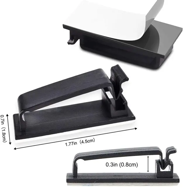 Samolepilno držalo za kabel: Te sponke so opremljene z močan samolepilni 3M trak, ki se prilepi na vse ravne in suhe površine kot so steklo, kovina, les, plastika, kamen, keramika itd. Enostavno jih je odstraniti brez ostankov ali poškodb.