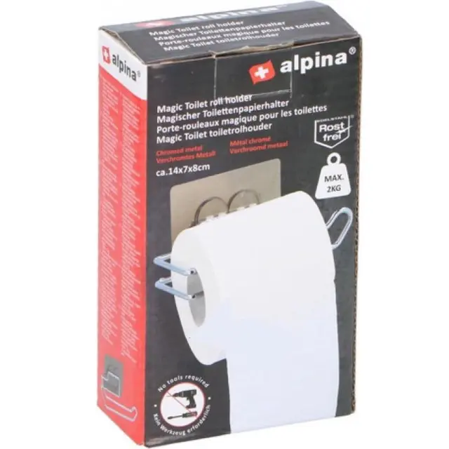 Držalo za toaletni papir Alpina srebrna je eleganten nosilec za toaletni papir za stranišče ali kopalnico. Držalo za toaletni papir lahko obesite brez orodja. Prav tako ni treba imeti lukenj v stenah. Držalo za toaletni papir je srebrne barve in izdelano iz nerjavečega jekla. To pomeni, da ga lahko obesite tudi v kopalnici. S to zasnovo lahko toaletni rolo preprosto obesite na držalo. Dimenzije držala so 8 x 7 x 14 centimetrov. Nosilec je iz Alpine.