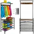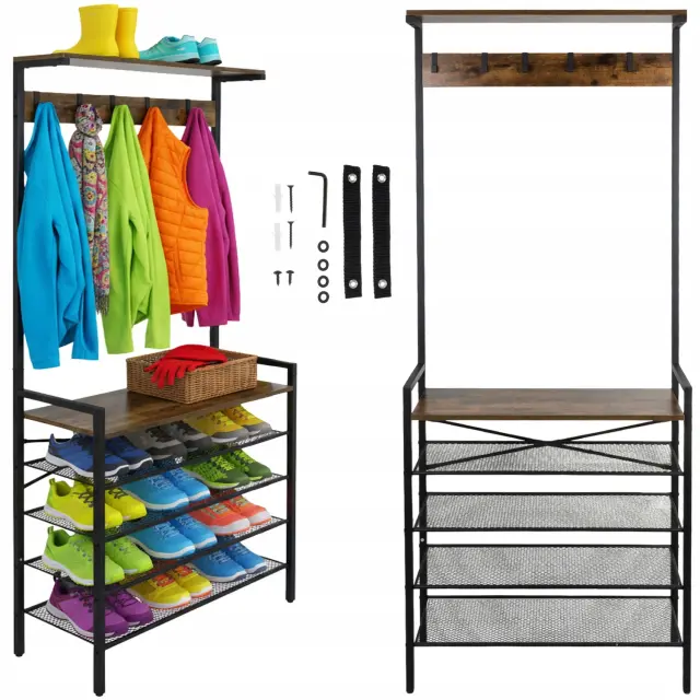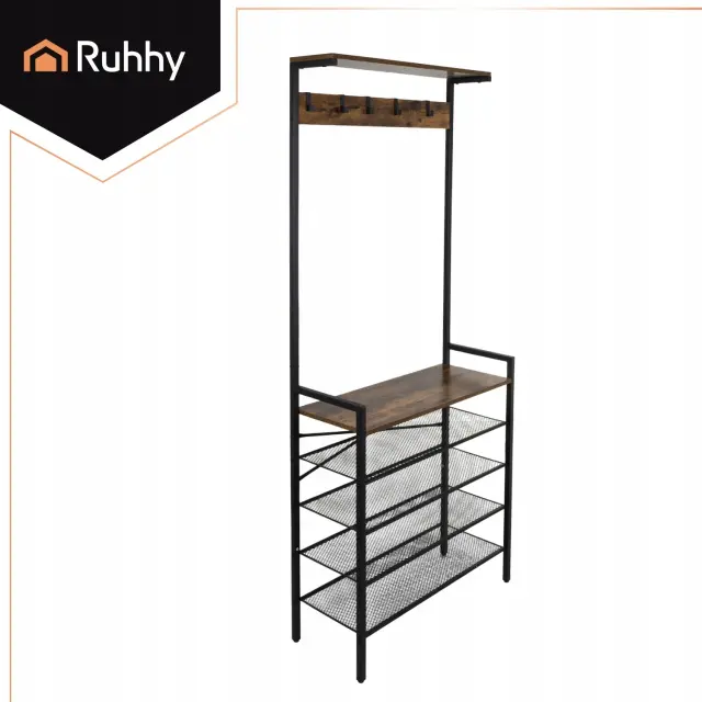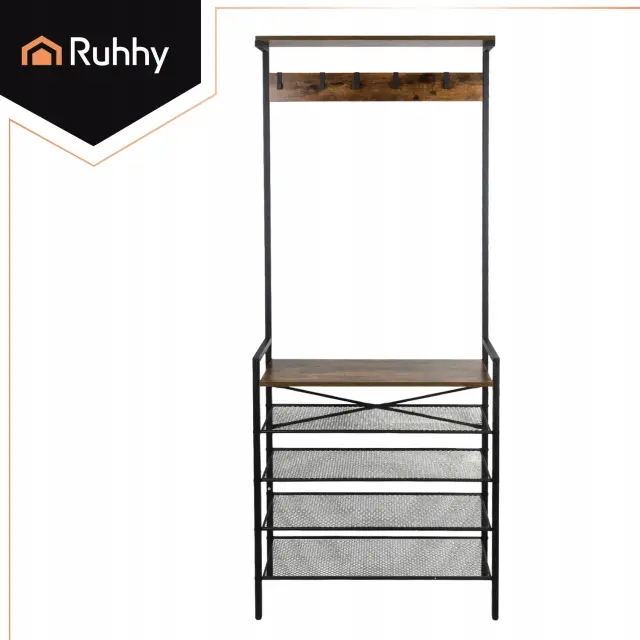 Samostoječa polica Ruhhy z obešalnikom je odlična rešitev za shranjevanje jaken, čevljev in torb, ki so vedno pri roki, hkrati pa ohranjajo eleganten videz. Trden kovinski okvir doda značaj, štiri zračne police in pet kavljev pa pomagajo ohranjati stvari organizirane brez kompromisov – vse je organizirano, vidno in pripravljeno, ko zapustite hišo.