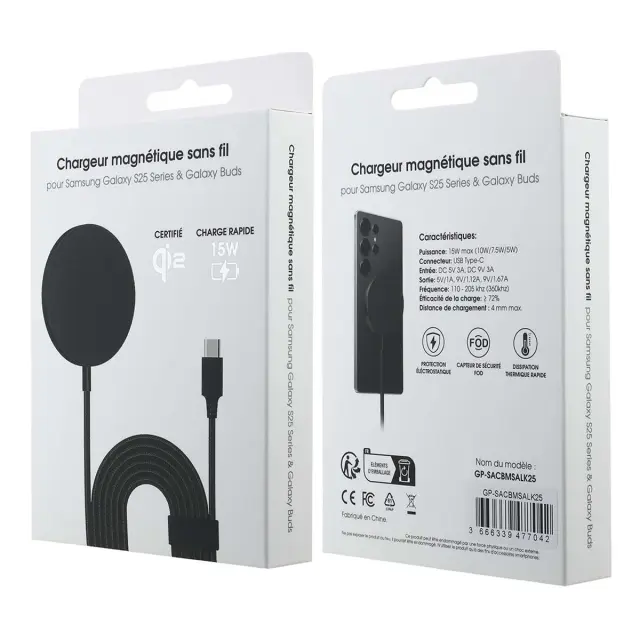 15W hitro polnjenje, ki polni naprave Samsung s polno močjo. Razširjena združljivost s pametnimi telefoni in brezžičnimi slušalkami s certifikatom Qi2. Vgrajeni senzor FOD zazna tuje predmete in preprečuje pregrevanje. Elektrostatična zaščita, ki zagotavlja največjo varnost za vaše priključene naprave.
