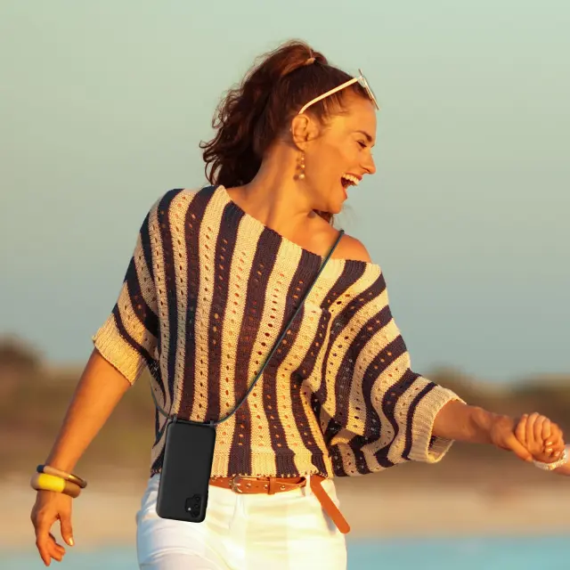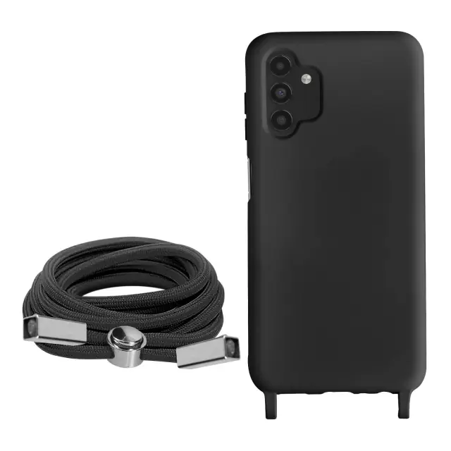 Ovitek za Samsung Galaxy A13 4G crn. To ohišje iz polikarbonata in silikonskega gela šciti mobilni telefon pred udarci in praskami. Ima nastavljiv 80 cm pleten najlonski trak za nošenje telefona okoli vratu ali kot naramnico.