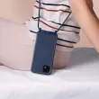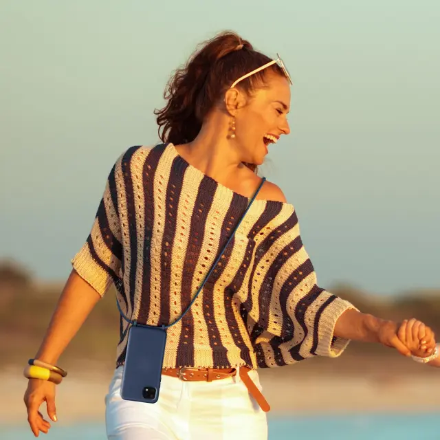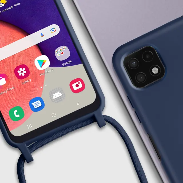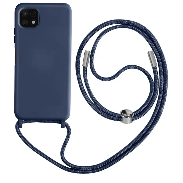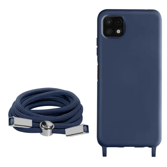 Ovitek s kablom Samsung Galaxy A22 5G moder. To ohišje iz polikarbonata in silikonskega gela šciti mobilni telefon pred udarci in praskami. Ima nastavljiv 80 cm pleten najlonski trak za nošenje telefona okoli vratu ali kot naramnico.