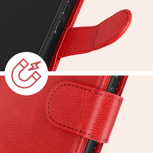 Ovitek za Samsung Galaxy A34 5G Chesterfield serija rdec. Ta ovitek ima denarnico, vgrajeno v podlogo s preklopom. Deluje tudi kot video podpora. Integriran je magnetni jezicek.