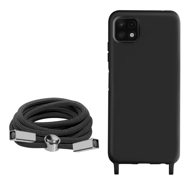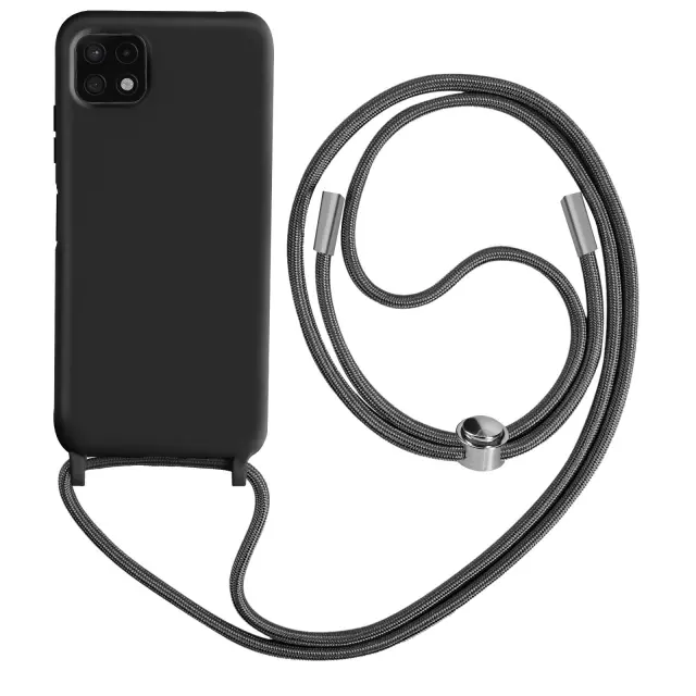 Ovitek za Samsung Galaxy A22 5G crn. To ohišje iz polikarbonata in silikonskega gela šciti mobilni telefon pred udarci in praskami. Ima nastavljiv 80 cm pleten najlonski trak za nošenje telefona okoli vratu ali kot naramnico.