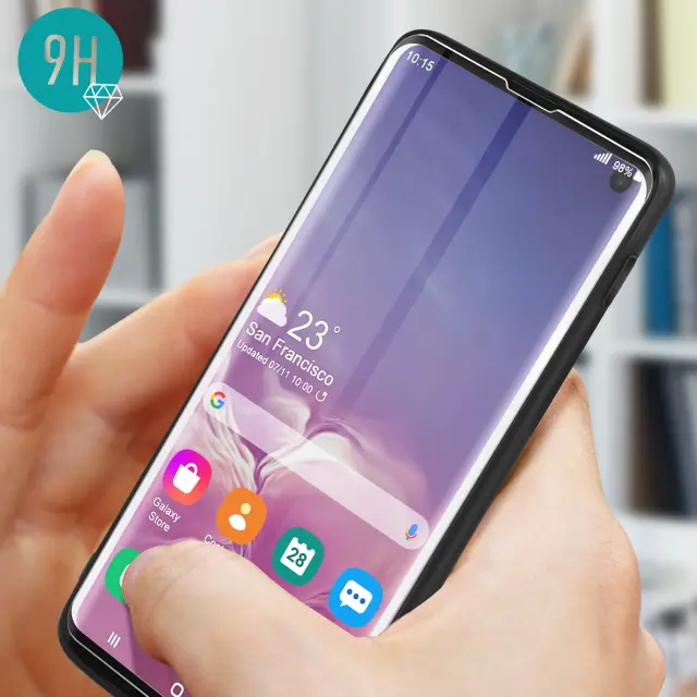 Zašcitni paket Samsung Galaxy S10 za 360° zašcito. Etui je izdelan iz silikonskega gela, odpornega na udarce in praske. Ukrivljeno kaljeno steklo 9H pa šciti zaslon pred praskami, hkrati pa ohranja lastnosti zaslona.