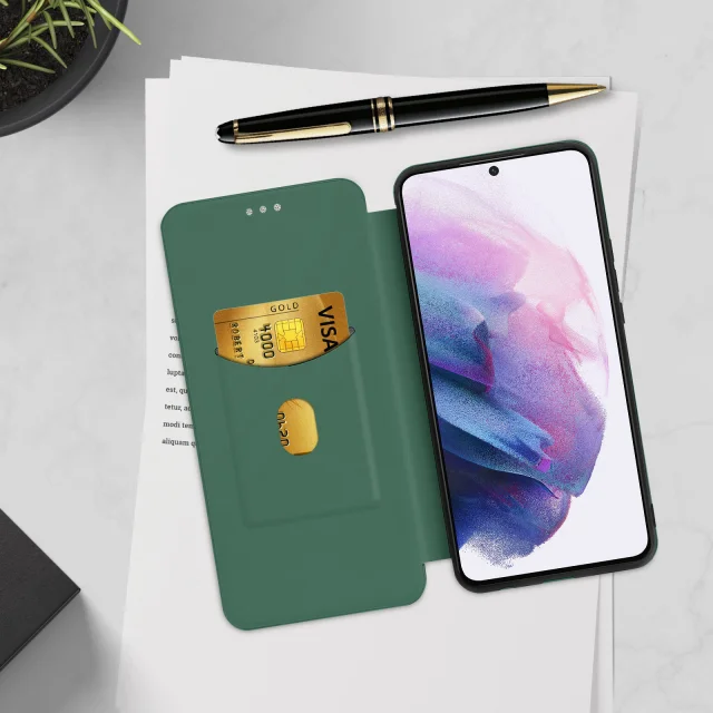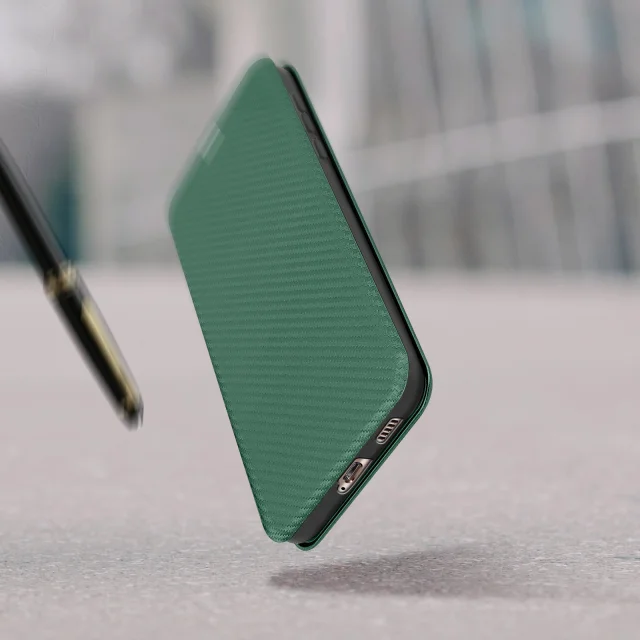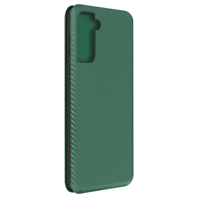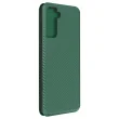 Samsung Galaxy S21 Plus Carbon Effect Design etui, držalo za kartico na preklop in zapestni trak s funkcijo stojala za video - zelena