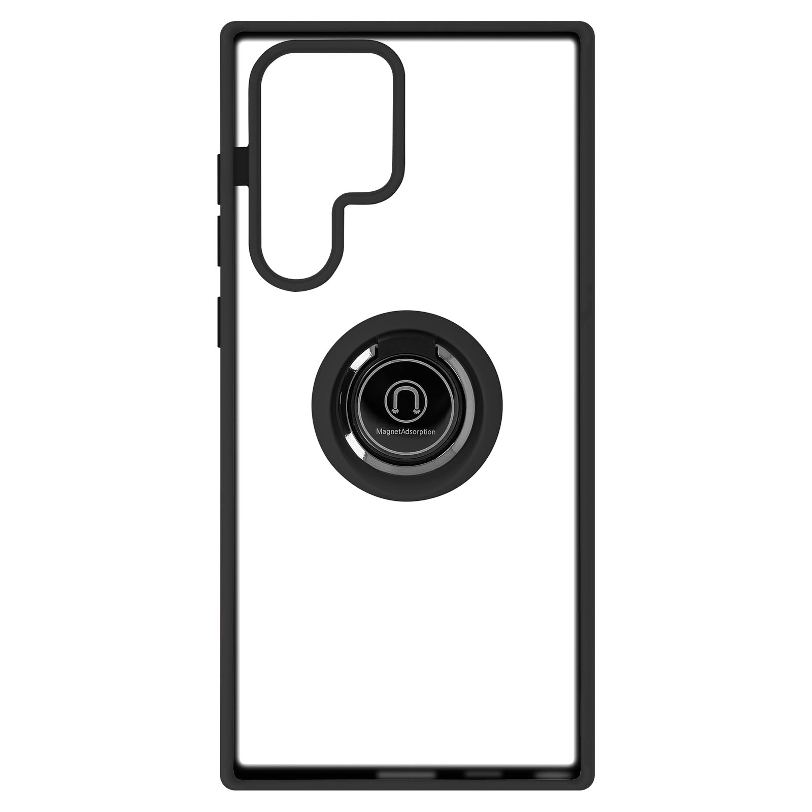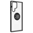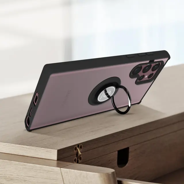 črna zaščitna torbica z obročkom posebej oblikovana za Samsung Galaxy S22 Ultra. Hrbtni obroč za varno uporabo v vseh okoliščinah. Obrnite prstan v vodoravno ali navpično stojalo, da v celoti uživate v svojem pametnem telefonu. Zaščitite svoj pametni telefon pred vsakodnevnimi udarci, padci in praskami.