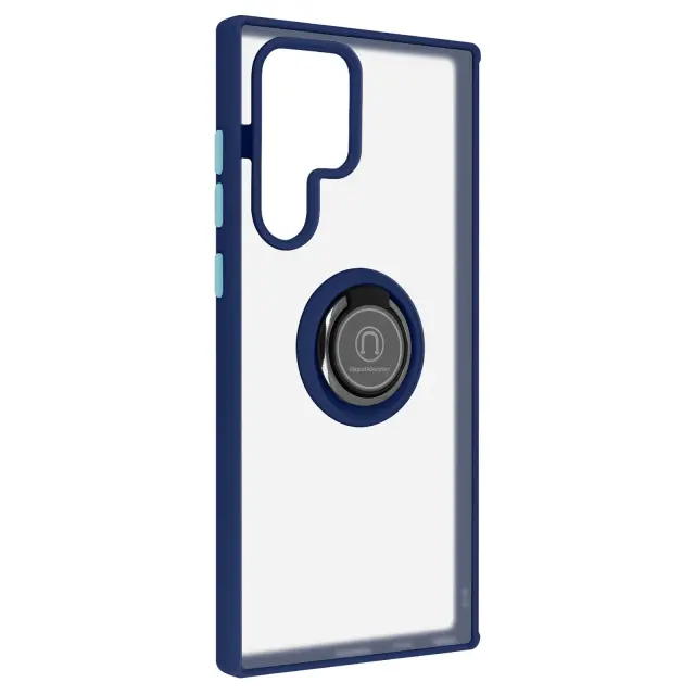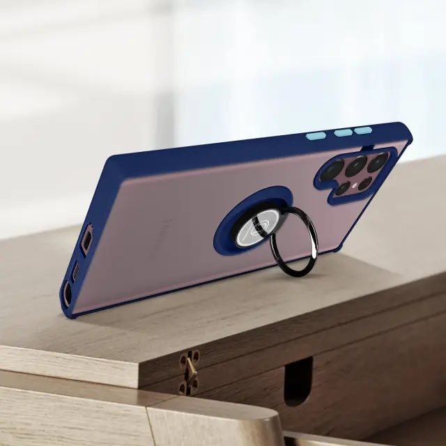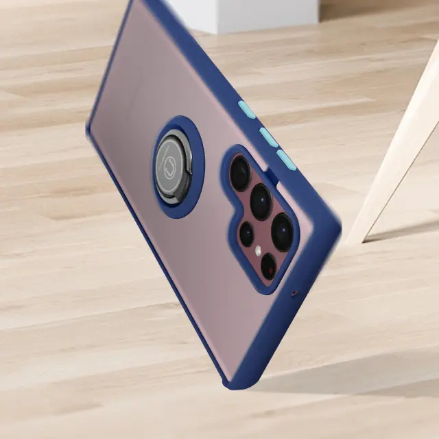 Modra dvomaterialna torbica za Samsung Galaxy S22 Ultra, šciti vaš telefon pred udarci in praskami. Zašcita z zadrževalnim obrocem, ki se lahko uporablja kot video nosilec in združljiv z magnetnim nosilcem (ni vkljucen). Mat zakljucek proti prstnim odtisom.