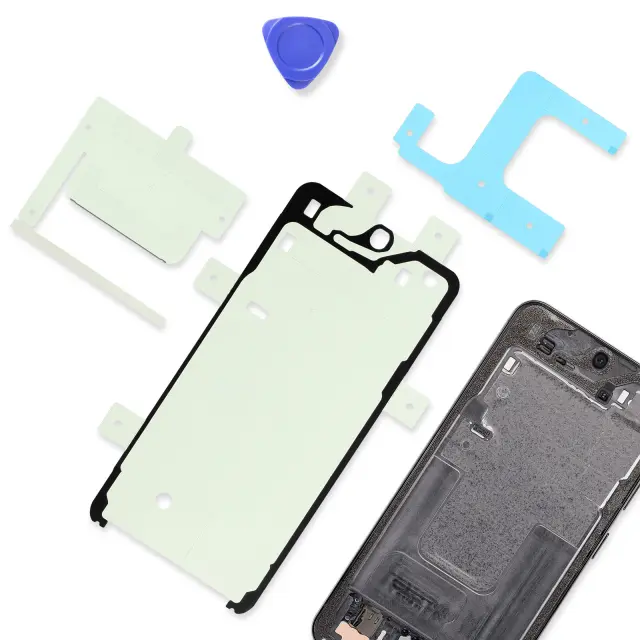 Originalni Samsungov lepilni komplet za namestitev zaslona Galaxy S23. Predhodno izrezane dvostranske nalepke za natančno pozicioniranje. Črno obodno tesnilo v skladu s specifikacijami proizvajalca. Uradna komponenta paketa Service Pack brez elektronike.