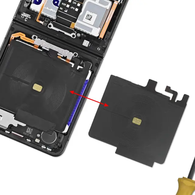 Namizni prt NFC za Galaxy Z Flip7, ki ustreza formatu in notranji postavitvi modela. Vgrajena krožna indukcijska tuljava za izmenjave NFC in brezžično polnjenje Qi. Prilagodljiva struktura za notranje nameščanje brez mehanskih obremenitev šasije. Enodelni induktivni sklop odpravlja potrebo po ločeni komponenti.
