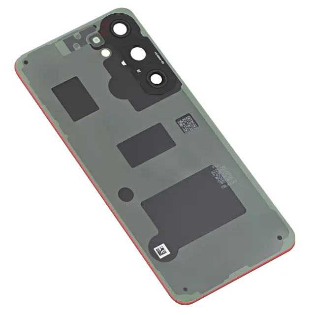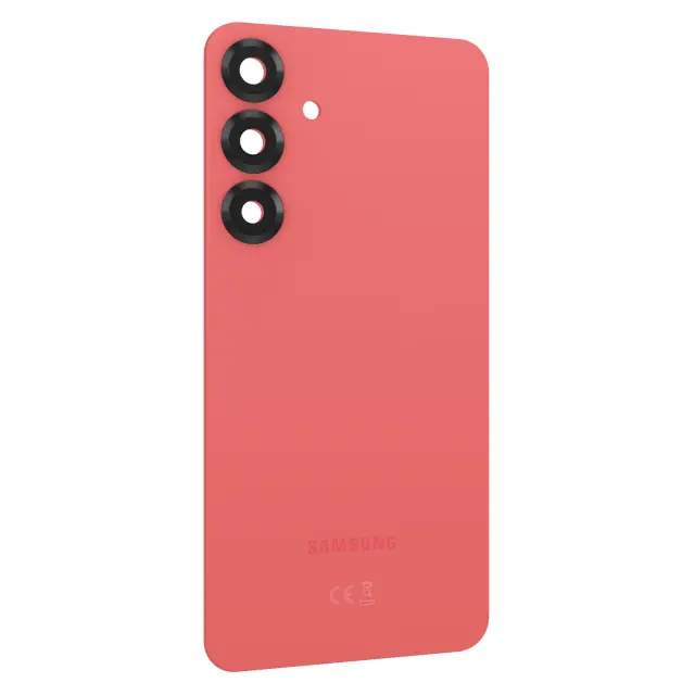 Pokrov baterije, združljiv izključno s telefonom Samsung Galaxy S25 Plus. Originalni servisni paket Samsung, številka dela GH82-36350G. Gladka koralno rdeča površina z logotipom Samsung in vgrajenimi regulativnimi oznakami. Strojno izdelan trojni izrez za kamero in odprtina za bliskavico z natančno poravnavo modula.
