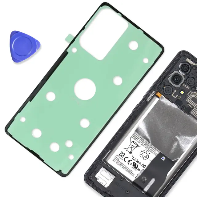 Originalni dvostranski lepilni trak Samsung Service Pack za pritrditev pokrova baterije Galaxy A53. Predhodno izrezani po velikosti za natančno poravnavo brez previsov ali zamikov. Ojačana opora za stabilno zapiranje zadnjega pokrova brez dodatnega tekočega lepila. Ponovna vzpostavitev strukturnega tesnjenja po odprtju ali zamenjavi pokrova baterije.