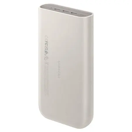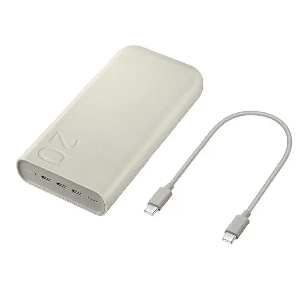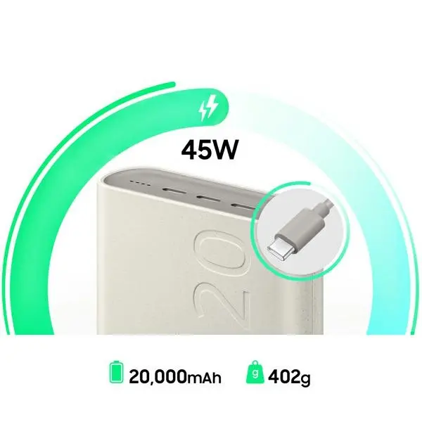Uradni Samsung prenosni polnilnik v bež barvi omogoča hitro polnjenje z močjo do 45W, kar vam omogoča priročno hitro polnjenje, ko ste na poti. Prosimo, upoštevajte: 45W super hitro polnjenje je možno samo ob priključitvi ene naprave. Če naprave ne polnijo, ga ponastavite s pritiskom na gumb za vklop za 7,5 sekunde.