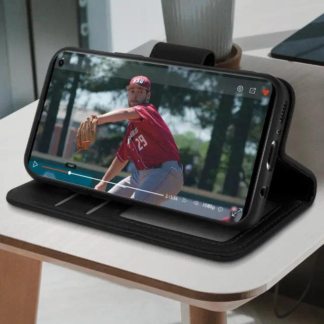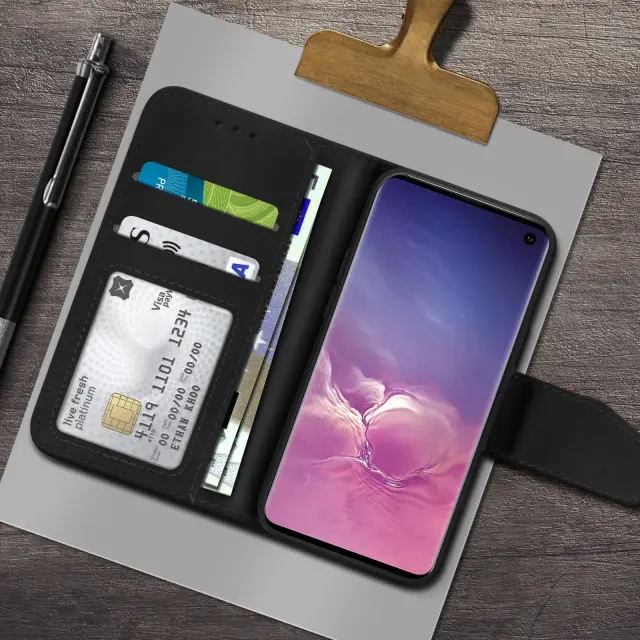 Praktičen in funkcionalen folio ovitek, posebej zasnovan za Samsung S10. Popolnoma zaščitite svoj telefon pred udarci in vsakodnevnimi nesrečami. Vrhunska prevleka iz umetnega usnja s šivano površino za kombinacijo modernosti in robustnosti. Reže za kartice in opombe vgrajene v oblogo pokrova.
