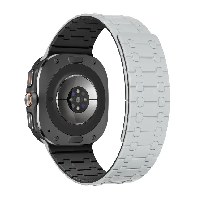 Eleganten dvobarvni dizajn: Elegantnemu silikonu se pridružuje kontrastni barvni poudarek, ki vašemu zapestju doda pridih prefinjenosti. Ta dvobarvni dizajn izboljša celoten videz vaše ure Samsung Watch Ultra in jo spremeni v eleganten dodatek za vsako priložnost.
