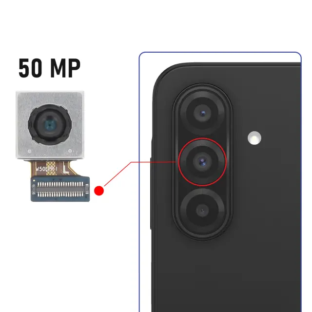 Ta fotoaparat ima širokokotni objektiv za široke in jasne posnetke v vseh razmerah. Fotografski senzor 50 MP, enak tistemu, ki je bil prvotno nameščen v Galaxy A26 in A17. Izvirni izdelek proizvajalca, ki zagotavlja optimalno kakovost fotografij. Idealno za obnovitev delovanja fotografij po poškodbi ali okvari.