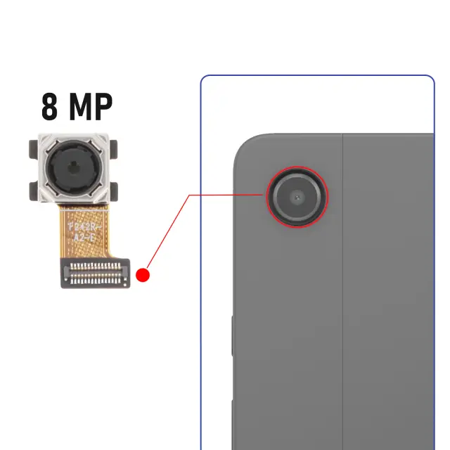 Uradna zadnja kamera 8 MP s samodejnim ostrenjem za ostre fotografije in tekoče videoposnetke. Kakovost slike v skladu z originalno konfiguracijo Samsung. Neposredna namestitev s proizvajalčevim namiznim prtom brez prilagajanja. Pakirano v servisnem paketu za zanesljivo montažo.