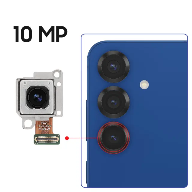 Uradna teleobjektivna zadnja kamera 10 MP za Galaxy S25 Plus. Vgrajen 3-kratni optični zoom brez izgube kakovosti za posnetke z velike razdalje. Hitro samodejno ostrenje in optična stabilizacija OIS za ostre slike. Neposredna namestitev z namiznim prtom proizvajalca, prilagoditev ni potrebna.