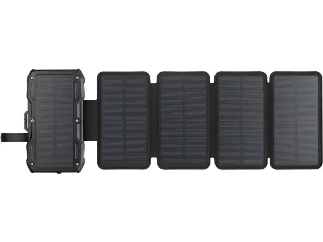 Solarna 5-panelna powerbank baterija 10.000 je kombinacija visokozmogljive powerbank baterije s kapaciteto 10000 mAh in zložljive sončne celice za hitro in učinkovito polnjenje na sončni svetlobi. Med pohodništvom jo lahko obesite na nahrbtnik. Vedno ste lahko prepričani, da imate napajanje za svoje mobilne naprave, ne glede na to, kako daleč ste od najbližje vtičnice. Materiali so odporni na vodo in udarce.