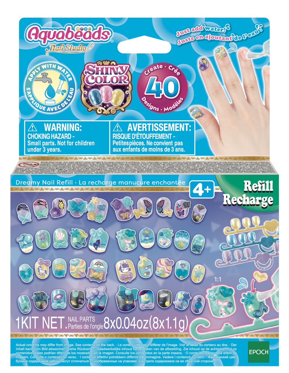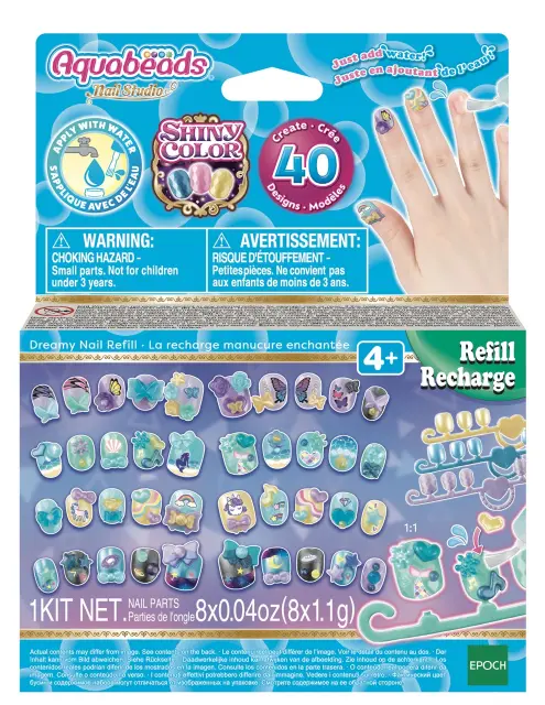Ta tematski komplet perlic za umetnost in obrt vključuje 40 Aquabeads nohtov z okraski v 8 barvah in nalepke. Sledite sliki na embalaži in naredite lep dizajn nohtov z motivi, kot so metulj, morska deklica, samorog, zvezda, roža in veliko več, ki jih lahko ustvarite tako, da priložene nohte in okraske Aquabeads sestavite z vodo iz pipe.