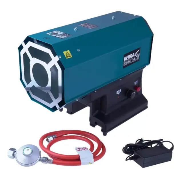 Da bi zadostili tem potrebam, je DEDRA v svojo ponudbo uvedla plinski grelec, ki se napaja tako iz vtičnice 230V kot tudi z možnostjo napajanja z baterijo. Zahvaljujoč uporabi 18V napajalnika je možna uporaba plinskega grelnika tudi na mestih brez električne napeljave, na primer v zgodnji fazi gradnje, samostojnih garažah itd. Grelnik ima nastavljivo moč gretja v območju 9- 20kW, kovinsko ohišje pa zagotavlja visoko vzdržljivost in odpornost na mehanske poškodbe. Stranska plošča ima indikator prazne baterije, ki omogoča enostaven nadzor nad stanjem baterije, ne da bi morali prekiniti delovanje grelnika ali spremeniti njegov položaj. Baterijski plinski grelnik DED7185H ima nastavljiv kot pretoka zraka, kar pomeni udobje uporabe na mestih z omejenim prostorom.
