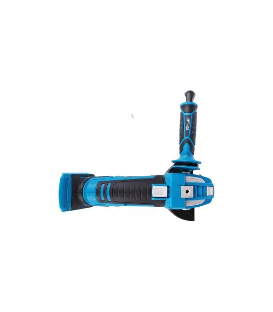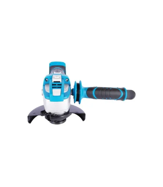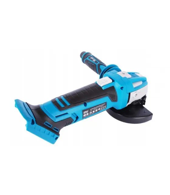 To orodje je zasnovano za rezanje in brušenje. Motor brusilnika doseže hitrost 9.500 vrt/min in je združljiv z diski velikosti 125 mm in 115 mm. Brusilnik je opremljen z varnostnim stikalom za izklop električne energije, ko je pritisk na obdelovanec prevelik, kar lahko povzroči poškodbe ali pregrevanje stroja. Sistem za hitro sprostitev rezila, stranski ročaj s tremi položaji in gumirano držalo naredijo orodje veliko udobnejše za uporabo. Ključ za menjavo rezila se nahaja v stranskem ročaju, tako da je vedno pri roki, ko je treba zamenjati rezilo ali nastavek za orodje. Ohišje je izdelano iz najlona, ojačanega s steklenimi vlakni, za večjo odpornost na mehanske poškodbe in UV sevanje. Ergonomija in udobje sta izboljšana z majhno težo enote in z gumo prevlečenim ročajem. Priporočena baterija za akumulatorski kotni brusilnik je 4,0 Ah.