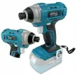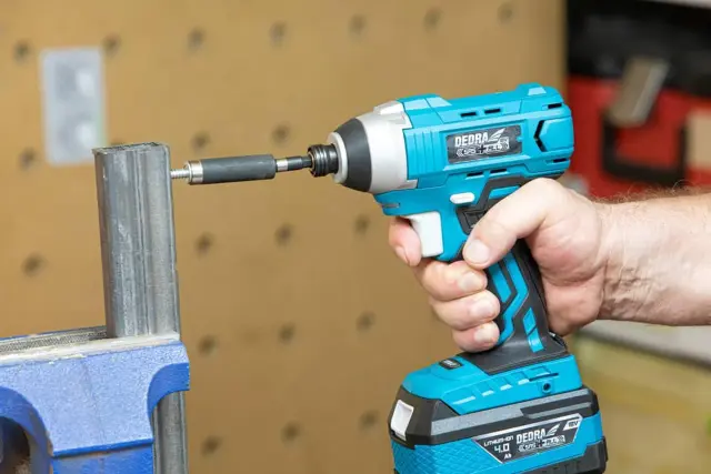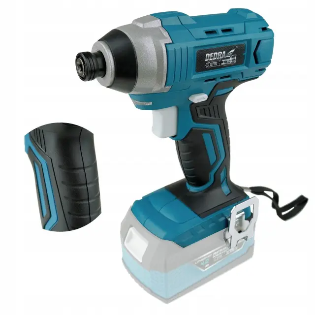 Orodje, ki se lahko uporablja tako pri gradnji kot v delavnici. Orodje je kompaktno, kompaktno in ima velik navor 110 Nm. Udarni izvijač je idealen za odvijanje in zategovanje zapečenih vijakov in sornikov. Ročaj 1/4″ ima dodatno zaporo, ki drži bit v ročaju in preprečuje, da bi med uporabo izpadel. Akumulatorski vrtljivi vijačnik je primeren tudi za težke izvijače, na primer za spajanje žičnih konstrukcij. Ohišje je izdelano iz najlona, ojačanega s steklenimi vlakni, karpovečuje odpornostproti mehanskim poškodbam in UV-sevanju. Ergonomija in udobje sta še boljša zaradi majhne teže enote in vgrajenega ročaja. Dodatna osvetlitev LED omogoča natančno delo na težko dostopnih mestih z malo svetlobe.