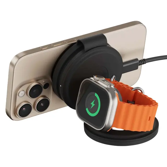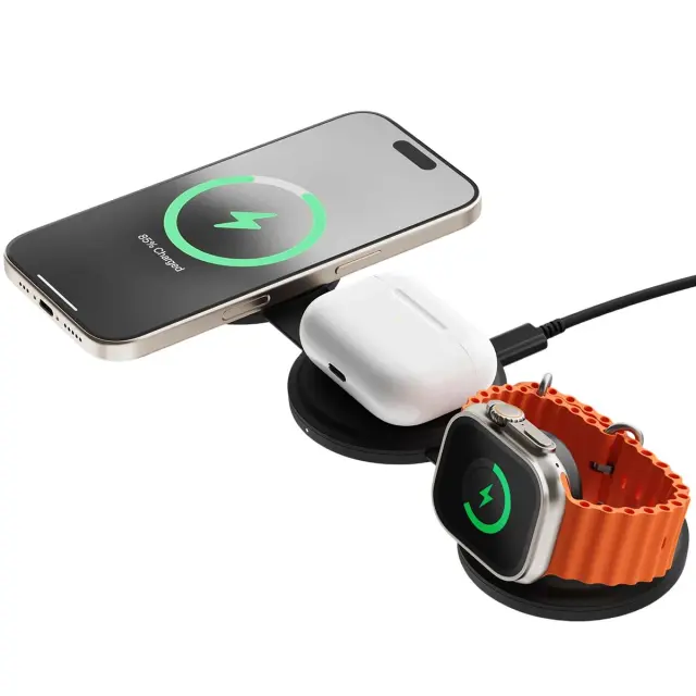 Najnovejša generacija tehnologije Qi2 za hitro brezžično polnjenje do 15 W za pametne telefone in 5 W za pametne ure ter združljive slušalke. Zasnova 3-v-1 za hkratno polnjenje telefona, ure Apple Watch in slušalk AirPods. Zložljiv, kompakten format, idealen za potovanja, z obliko, ki je idealna za potovanja, pisarno ali vsakodnevno uporabo doma.. Premijski materiali z mehkim dotikom, odporni na praske, za dolgotrajno vzdržljivost, stabilnost in dober videz.