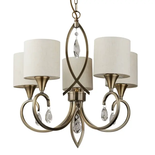 Searchlight Alberto Stropna svetilka s 5 lučkami in več kraki, starinska medenina, kremna s kristali, E14