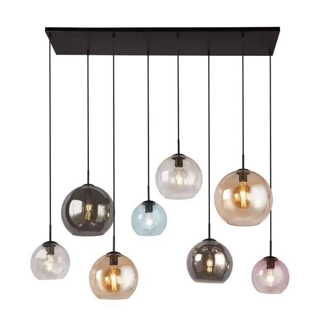 Searchlight Viseča svetilka Mardi Gras z 8 svetlobnimi palicami, mat črna, večbarvni stekleni senčniki