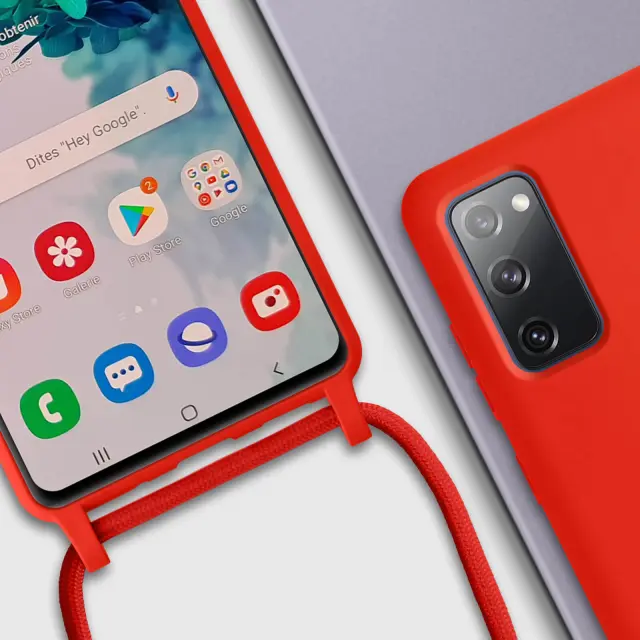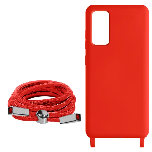 Ovitek s kablom za Samsung Galaxy S20 FE rdec. To ohišje iz polikarbonata in silikonskega gela šciti mobilni telefon pred udarci in praskami. Ima nastavljiv 80 cm pleten najlonski trak za nošenje telefona okoli vratu ali kot naramnico.