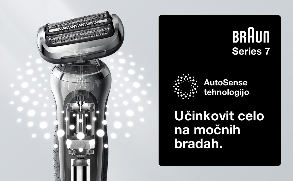 ● Učinkovit celo na močnih bradah: tehnologija AutoSense analizira vašo brado in prilagodi moč njeni gostoti, da zajame in odreže več dlak z vsakim britjem