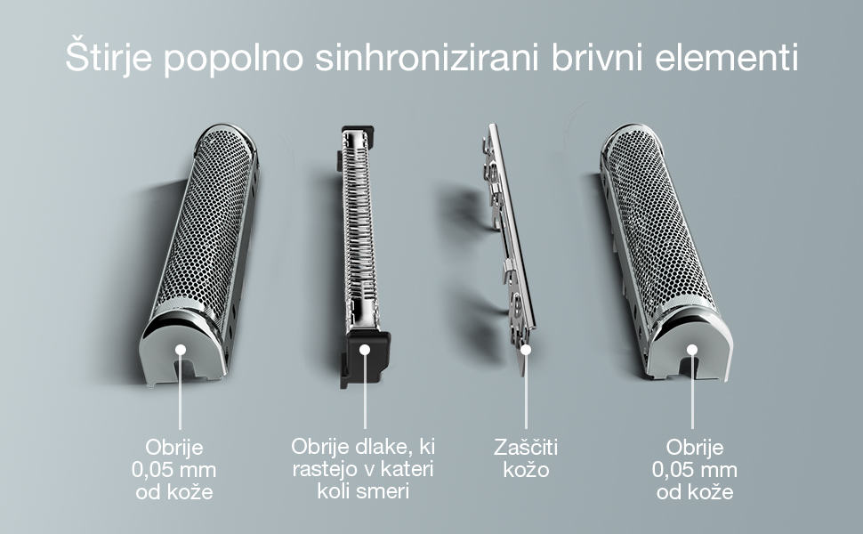 Obrije 0,05 mm od kože Obrije dlake, ki rastejo v kateri koli smeri Zaščiti kožo Obrije 0,05 mm od kože